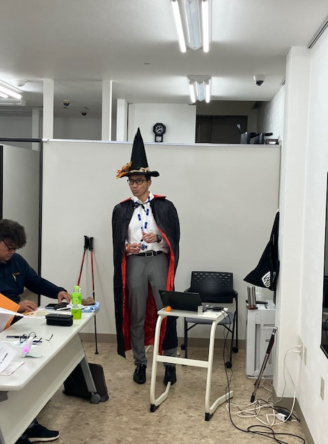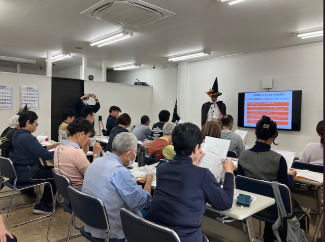 まずは「認知症の基礎知識、認知症の方への接し方等」。今週末にハロウィンを控え弊社代表鈴木が仮装して登場。
