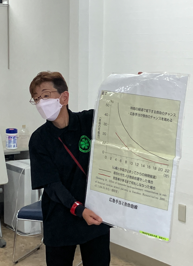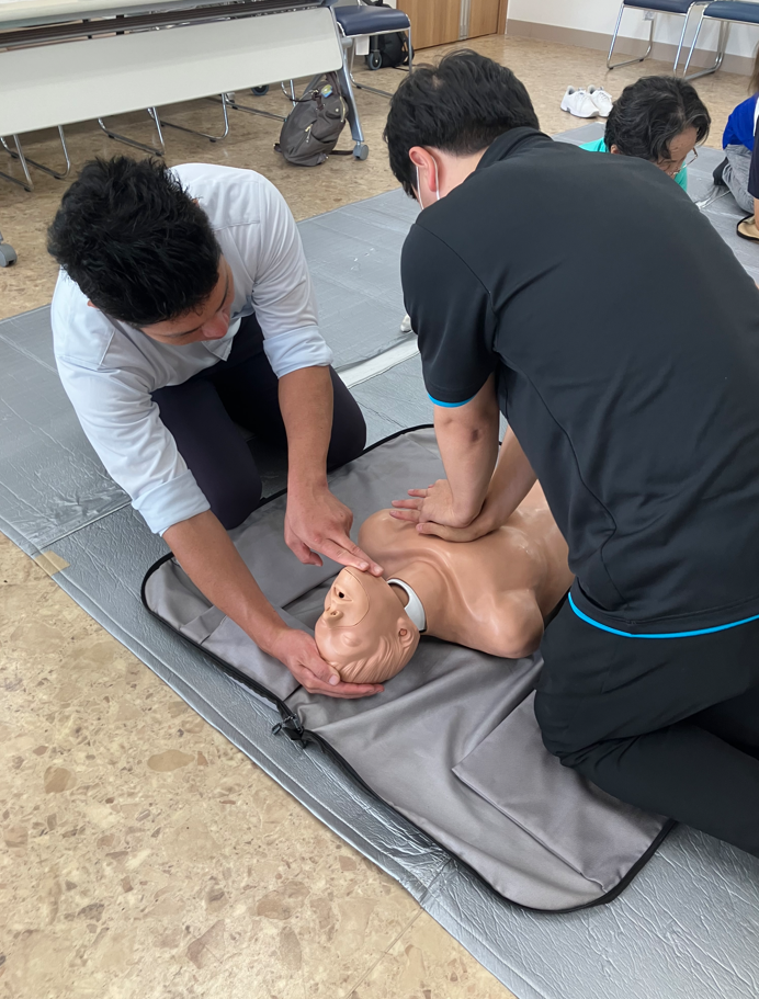 講師:駿東伊豆消防本部 柴田さまご指導のもと、胸骨圧迫のやりかたやAEDの使用方法などを学びました。