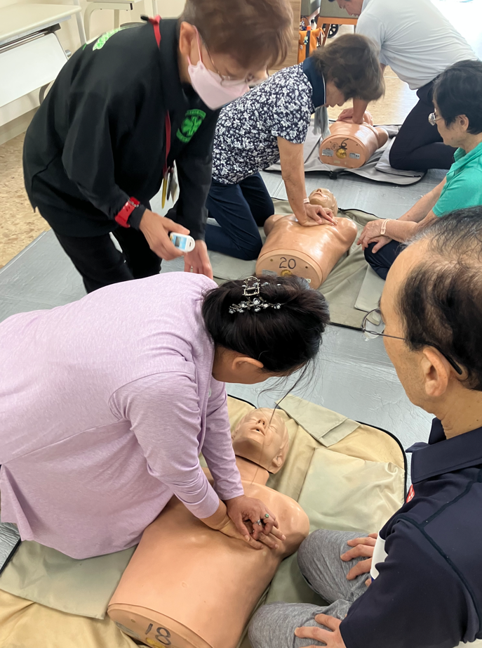 講師:駿東伊豆消防本部 柴田さまご指導のもと、胸骨圧迫のやりかたやAEDの使用方法などを学びました。